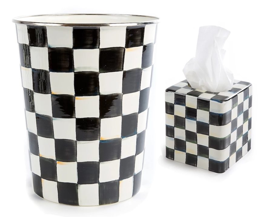 Termasuk dalam iniSet Kamar Mandi MacKenzie-Childs($180) adalah tempat sampah dan tutup kotak tisu berpola kotak-kotak yang dipasang secara manual.