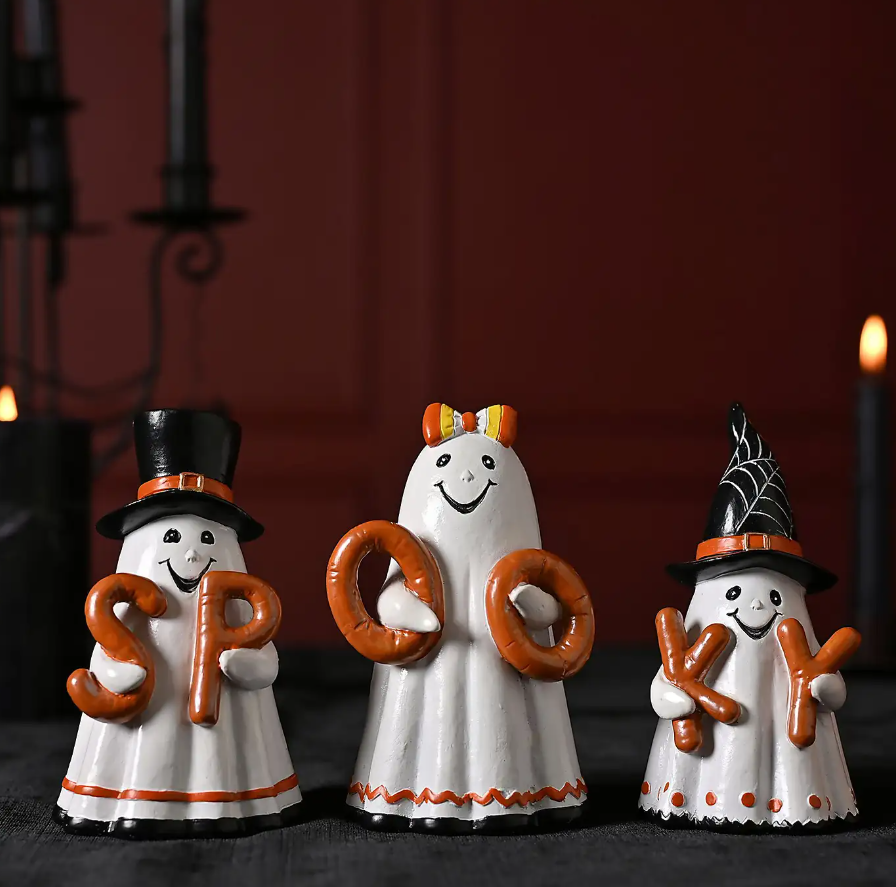 Tambahkan sentuhan humor Halloween ke rumah Anda dengan tiga hiasan labu Hocus Pocus ini. Setiap labu membawa karakter uniknya masing-masing, membentuk kata ‘SPOOKY’ dalam huruf oranye tebal. Dua di antaranya memakai topi hitam klasik, sementara yang di tengah mengenakan ikat pinggang bergaris – karena bahkan hantu juga suka sedikit gaya!