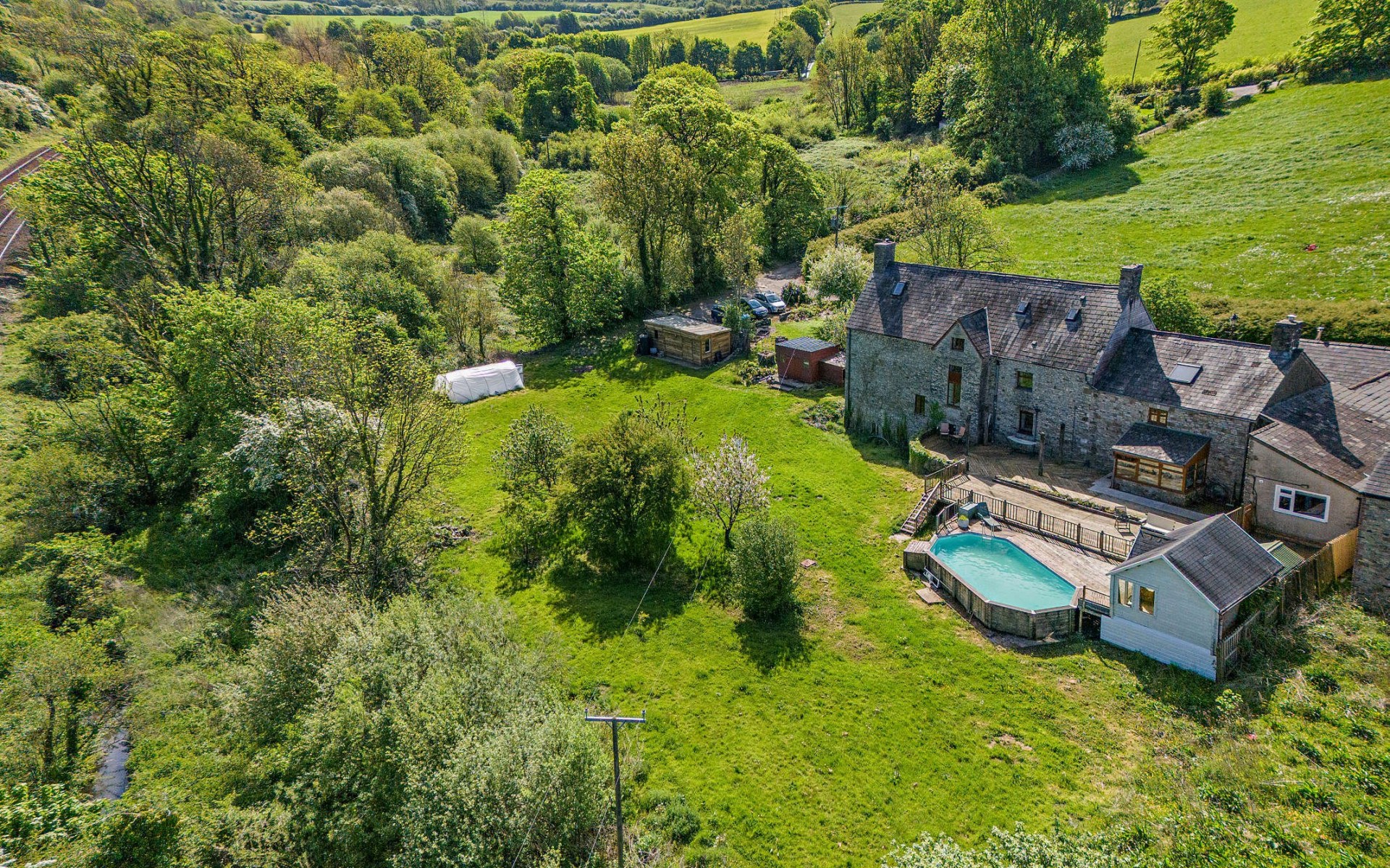 Lahan yang luas merupakan fitur utama, dengan kolam renang berpemanas, kandang kuda, dan pohon buah-buahan — sempurna bagi pembeli yang menginginkan privasi pedesaan namun dekat dengan Bridgend dan kota pesisir Porthcawl.