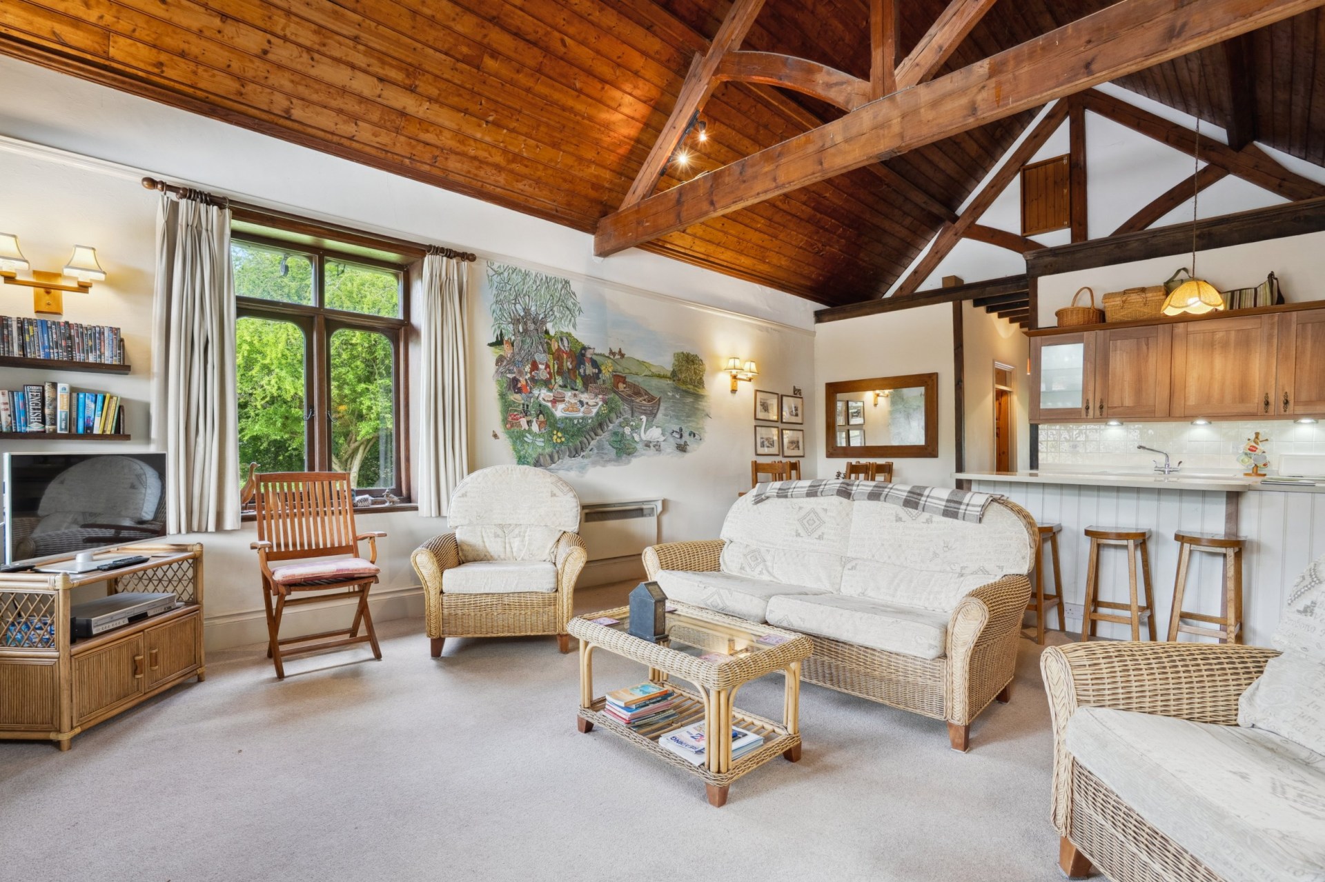 Ruang hidup lantai pertama menarik dengan langit-langit yang tinggi, balok oak yang terbuka, dan mural khusus yang secara artistik membagi ruang tamu yang terbuka menjadi area lounge, ruang makan, dan dapur.