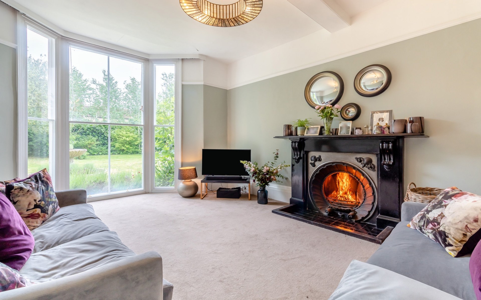 Bayangkan ruang makan dengan perapian klasik, ruang tamu dengan dua sisi yang dilengkapi rak buku yang sudah dipasang, dan ruang duduk dengan jendela bay dan perapian baja yang mencolok.