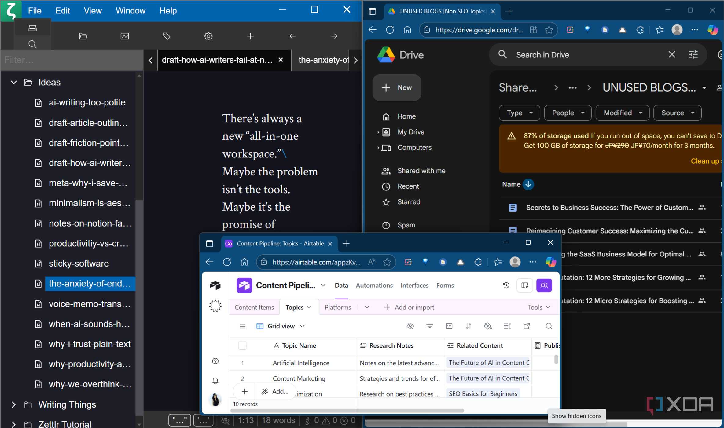 Hasil praktisnya: Saya menulis tiga blog dalam seminggu, semuanya didasarkan pada sumber yang muncul dari koneksi NotebookLM. Salah satunya menjadi artikel tentang mengapa alat penulisan AI gagal dalam nuansa (menggabungkan catatan tentang bahasa penghindaran ChatGPT dengan pengamatan tentang bagaimana Grammarly terlalu menyederhanakan saran nada). Yang lain berubah menjadi analisis tentang kelelahan aplikasi produktivitas (menghubungkan keluhan yang tersebar menjadi sebuah thesis yang koheren tentang kelebihan fitur). Yang ketiga menjelajahi mengapa saya berhenti menggunakan alat tertentu meskipun populer (NotebookLM menunjukkan bahwa saya telah mencatat sebuah pola tentang aplikasi yang memprioritaskan fleksibilitas daripada desain yang jelas). Jika Anda bekerja dalam tim kreatif, Anda bisabahkan buat menjadi umum.