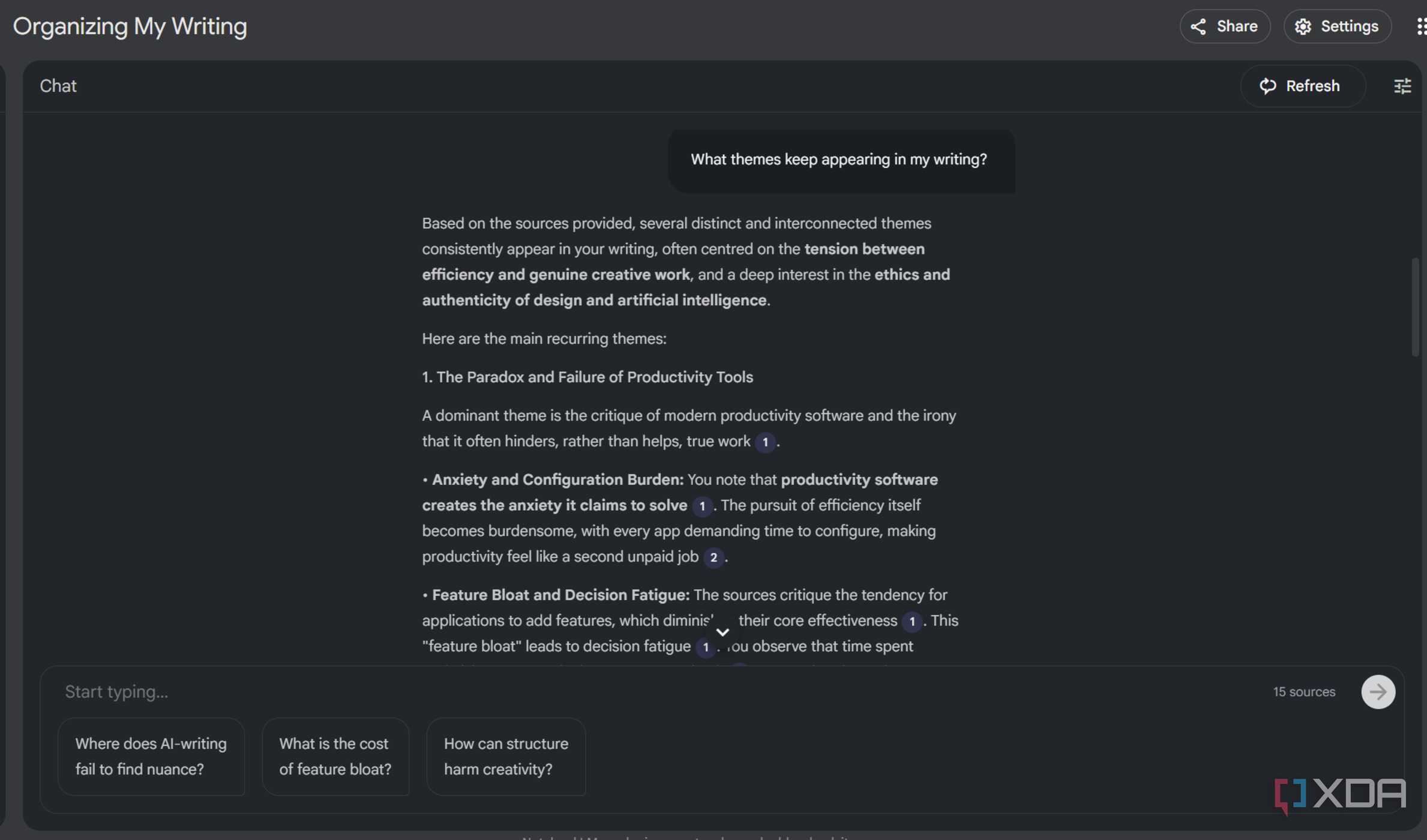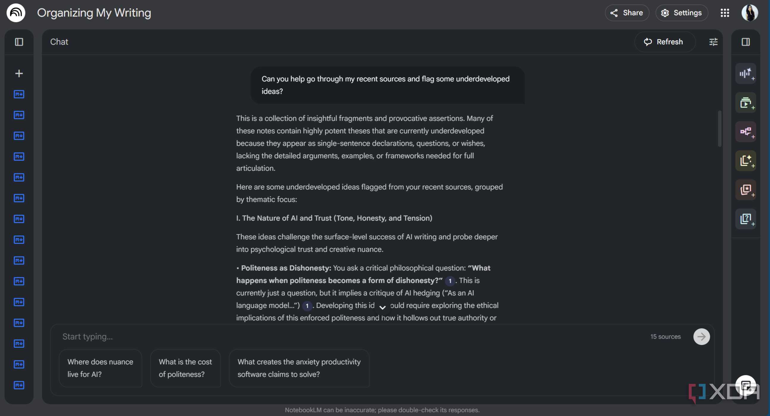 NotebookLM terkadang salah memahami konteks atau terlalu menekankan poin yang tidak relevan. Namun, kesalahan pemahaman ini bisa bermanfaat. Ketika ia mengatakan saya “mengkritik desain minimalis,” awalnya saya tidak setuju — lalu menyadari bahwa saya meragukan sesuatu, bukan tentang minimalisme itu sendiri, tetapi bagaimana seringkali hal itu digunakan untuk membenarkan penghapusan fitur yang membantu. Interpretasi yang tidak sempurna dari AI ini memaksa saya untuk menjelaskan lebih lanjut.nyataposisi, yang menjadi sudut pandang artikel tersendiri. Nilai sebenarnya bukanlah ituNotebookLM menggantikan berpikir kreatif. Itu membuat tahap ideasi yang kacau tersebut menjadi terlihat dan bisa diubah.