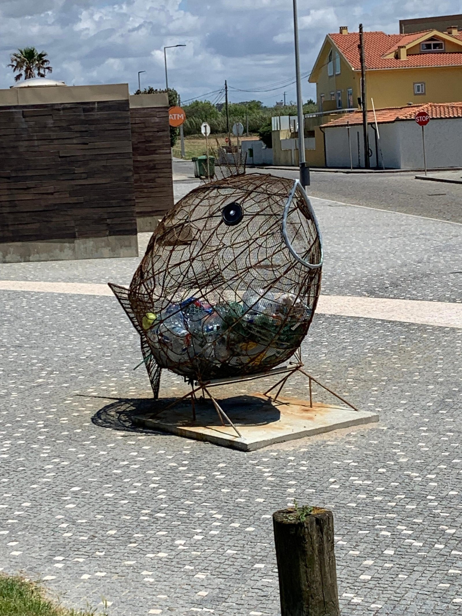 Tidak ada tanda dengan instruksi, hanya saja tempat yang ramah untuk memasukkan barang daur ulang Anda. Saya ingat berpikir bahwa jika kita memiliki wadah yang lucu di negara-negara bagian, mungkin lebih banyak orang akan patuh. Saya menemukan ikan paus kawat dengan mulut terbuka dan mata hitam cerah yang menarik perhatian.