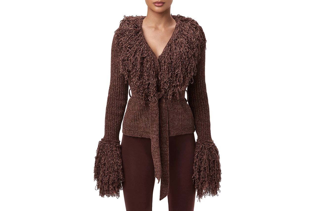 Saya sudah lama menginginkan mantel panjang dengan kerah bulu, sejak saya bisa ingat, tetapi saya tinggal di Los Angeles. Saya tidak punya alasan sama sekali untuk memakainya di sini, jadi saya memilih untuk memakai kardigan dengan gaya serupa. Temuan dari Naked Wardrobe ini dibuat dari benang chenille berkilau dan membuat warna merah tua terlihat lebih menonjol. Saya akan memakainya secara sederhana dengan celana jeans dan sepatu bot; saya merasa ini akan menjadi pakaian yang selalu mendapat pujian.